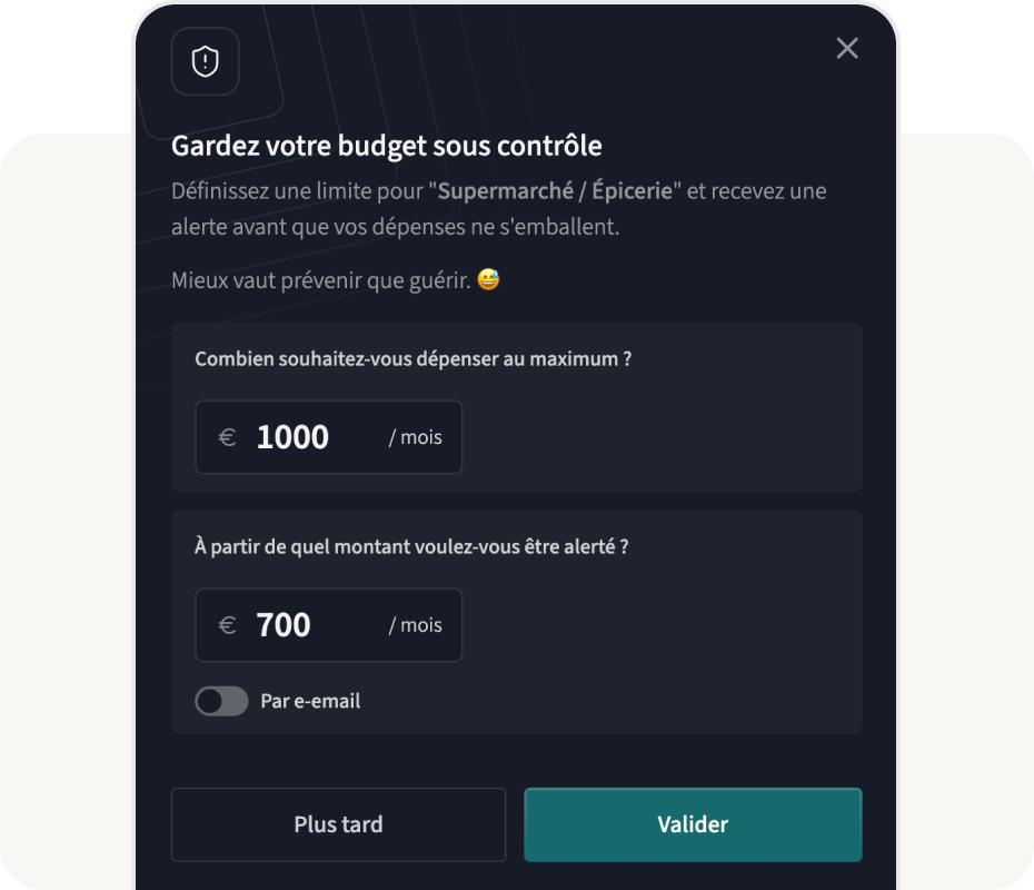 Une alerte vous prévient par notification ou email dès que vous approchez de votre limite, pour que vous gardiez le contrôle sans mauvaise surprise.